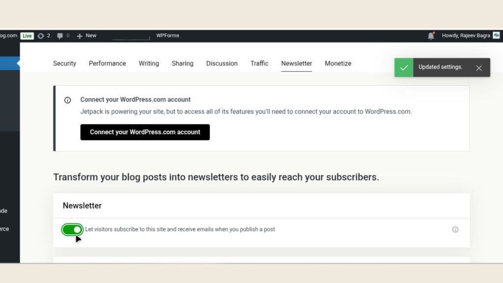 - Jetpack (free) — includes Subscriptions / Newsletter that can send email notifications to subscribers automatically when you publish new posts. Very low friction: install Jetpack, enable Subscriptions/Newsletter and add the Subscribe block.